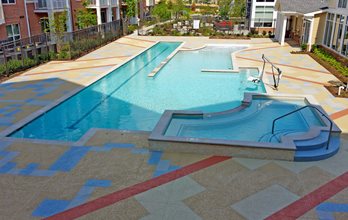 In addition to being customizable—here with custom colors and patterns—the Classic Texture coating is easy to clean, making it a favorite among maintenance crews. Using the provided plans, SUNDEK of Washington contractors hand-taped the pattern and carved the geometric design. Since the apartment complex wanted the concrete coating to be colorful, SUNDEK of Washington used five colors from their signature collection. Bands of Terra Cotta emanate from the pool diagonally out to the end of the concrete. Tweed Gray, Indian Wheat, Peking Blue, and Franciscan Tan were used for the rest of the design.